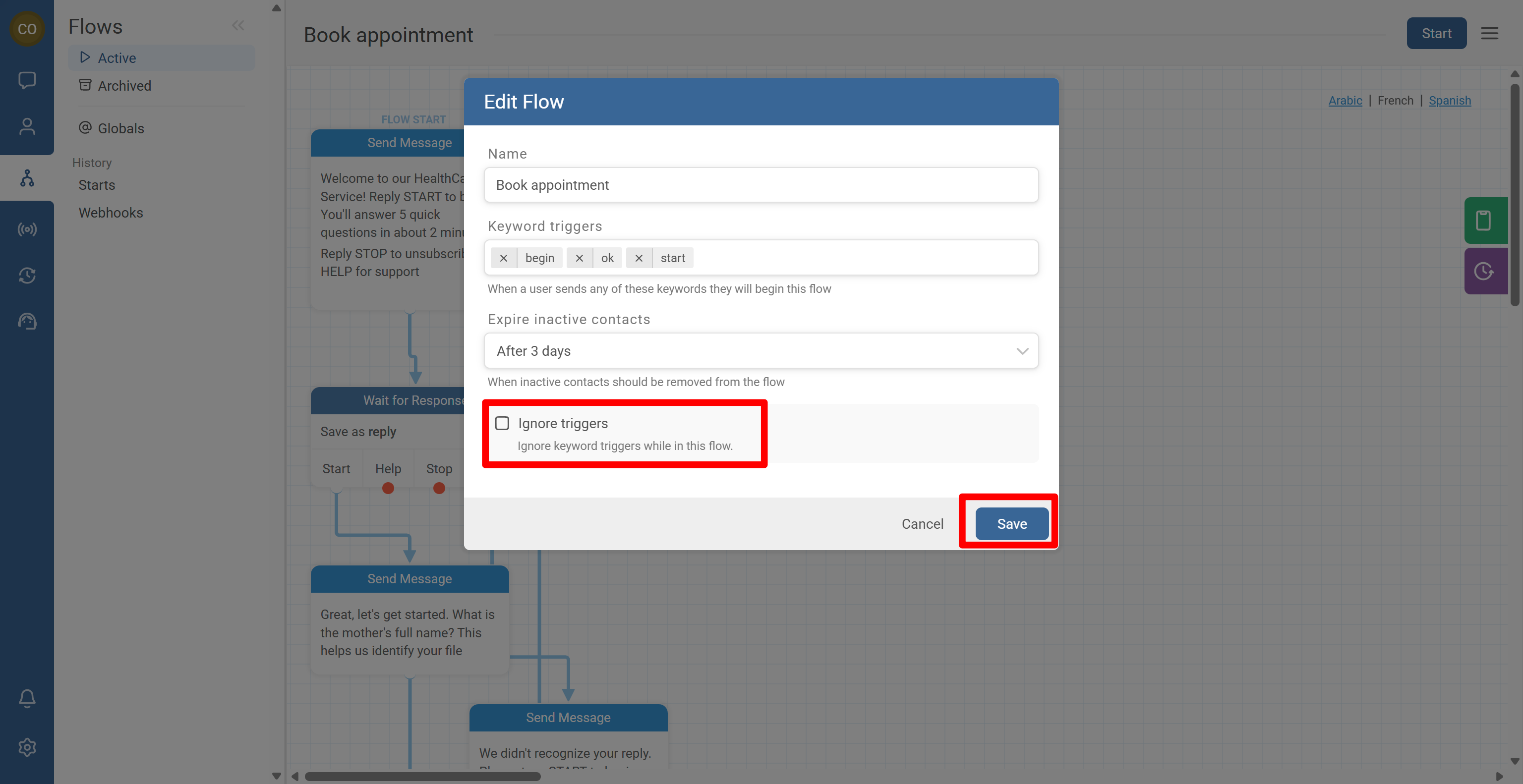- Enable Ignore keyword triggers while in this flow and save