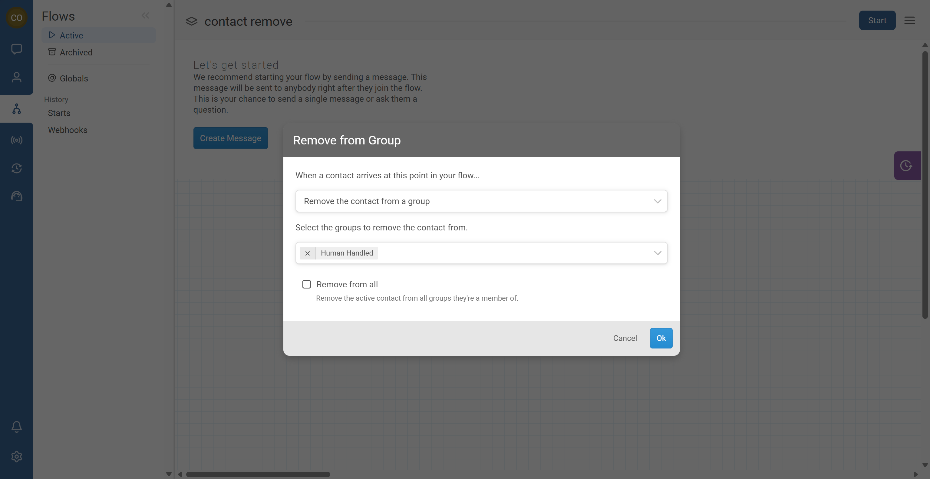 In this example, the flow removes the contact from a group named Human Handled, which is used to prevent keyword/catch-all triggers