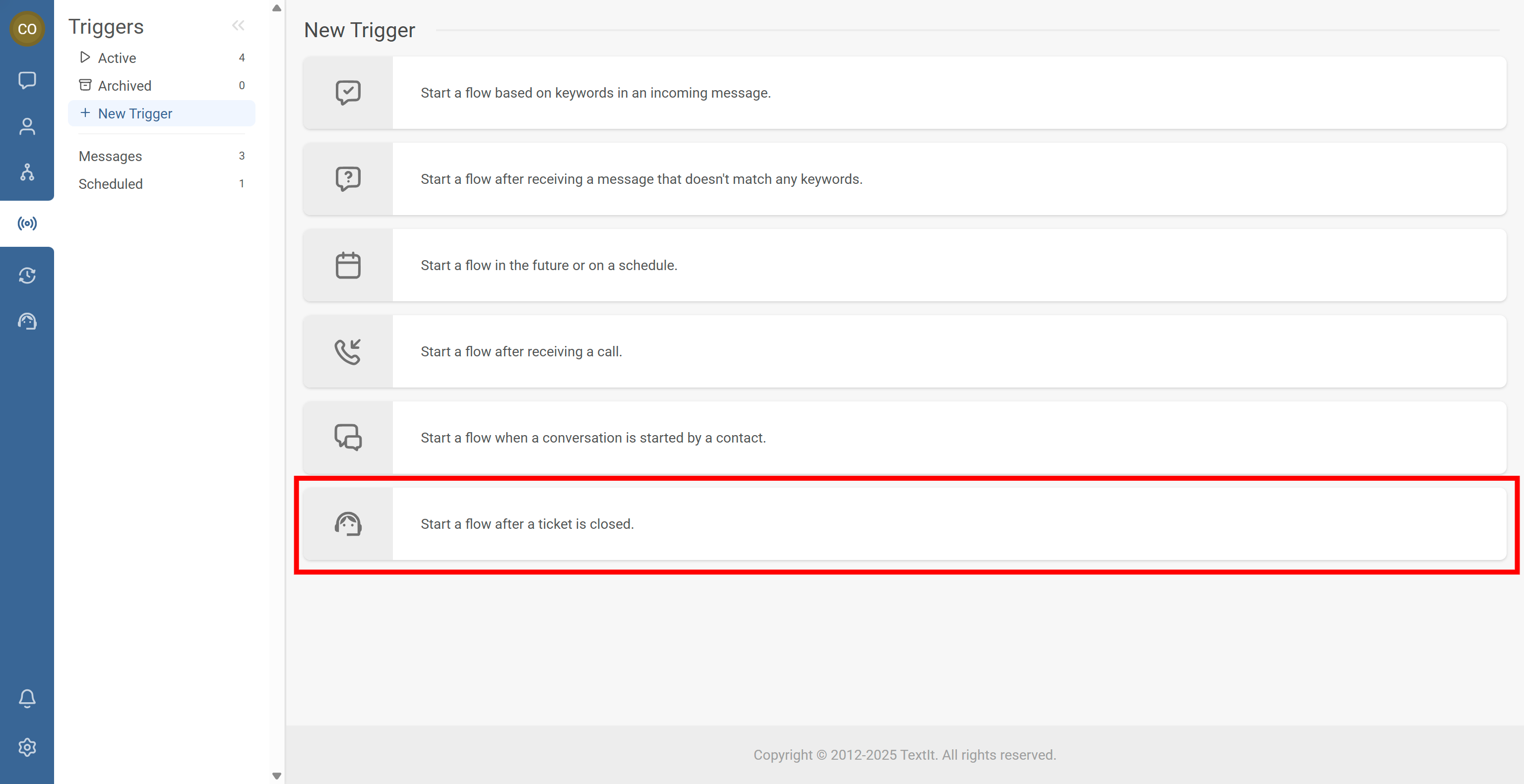 3. Select Start a flow after a ticket is closed.