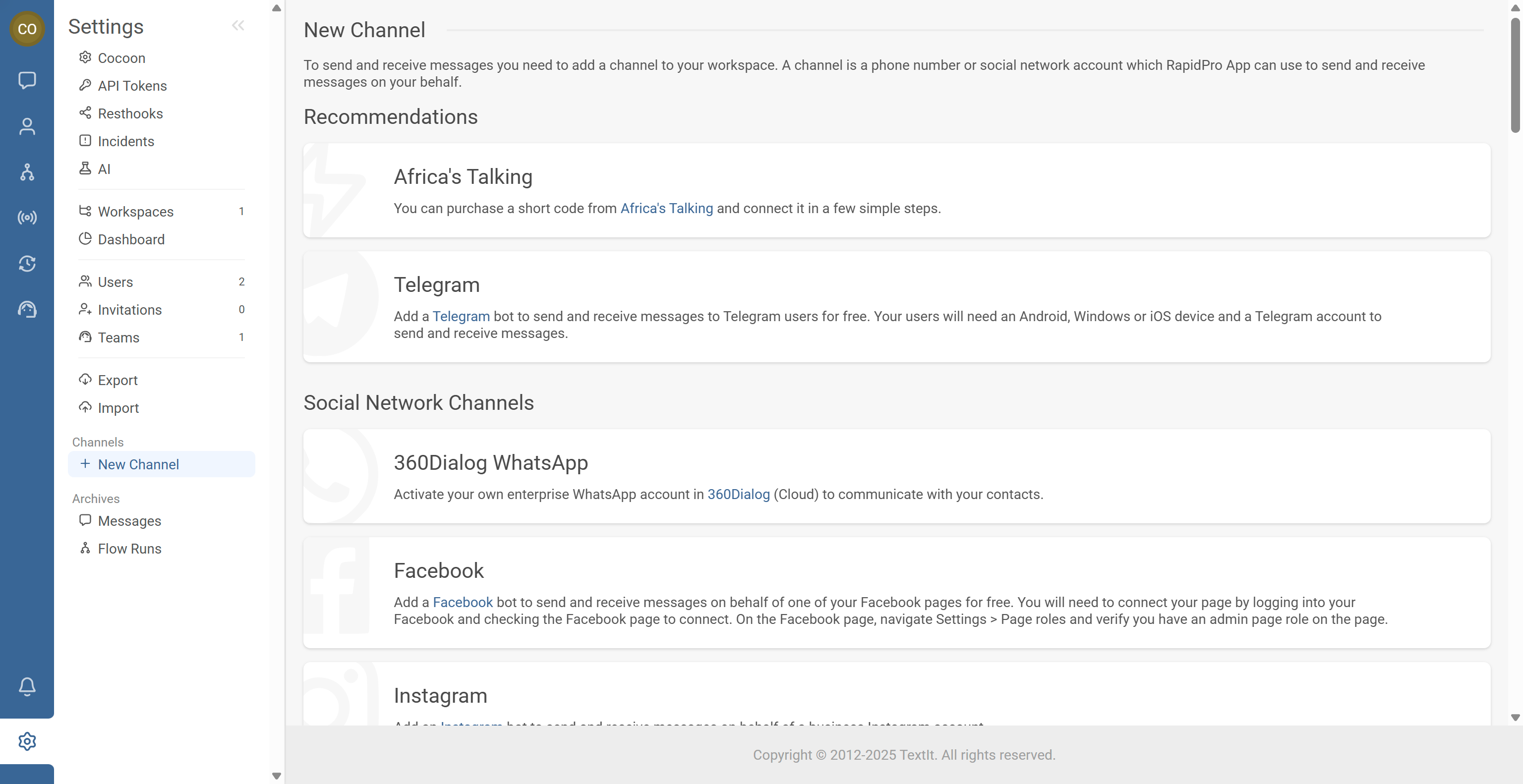 - Add your first channel (Workspace settings → Channels)