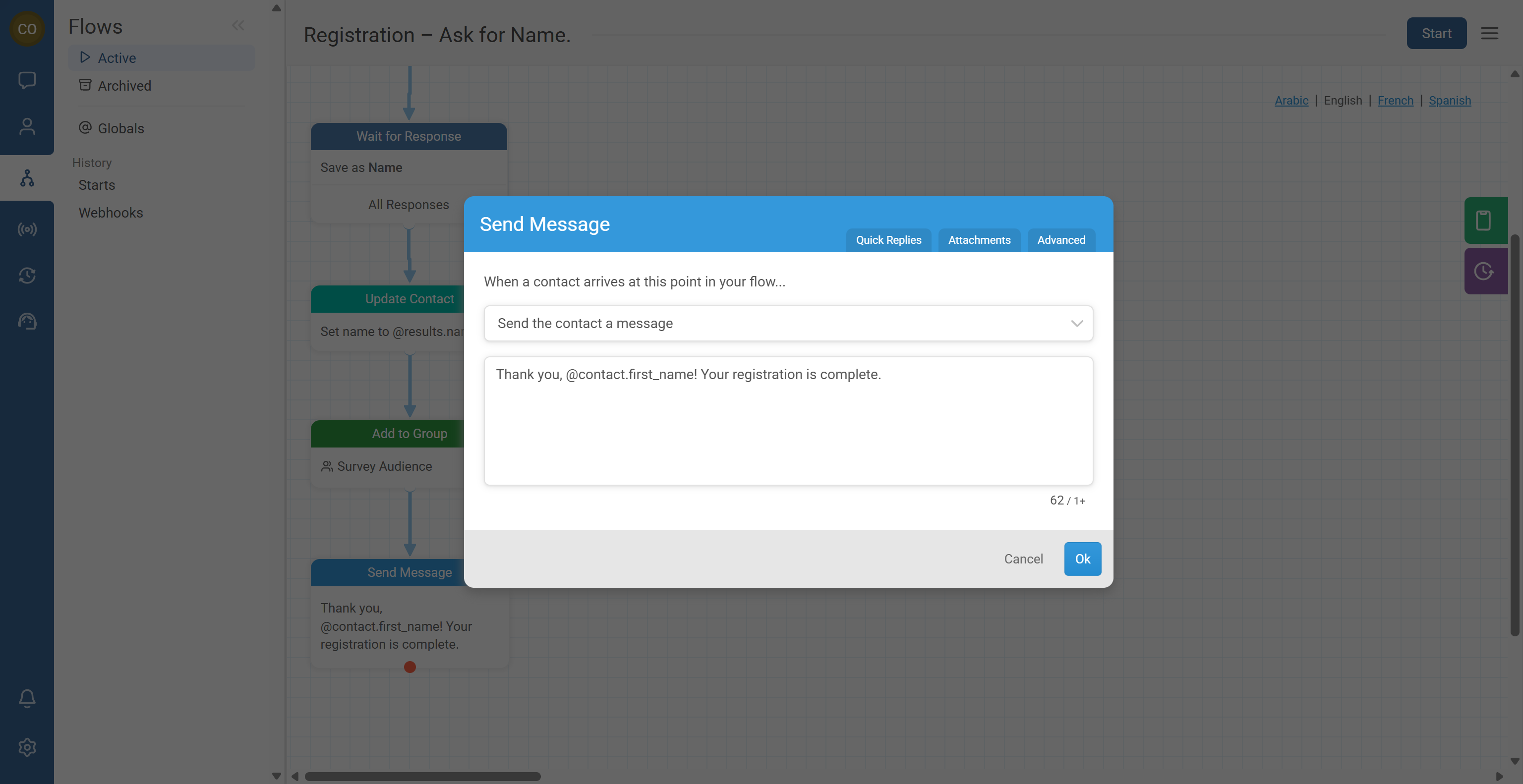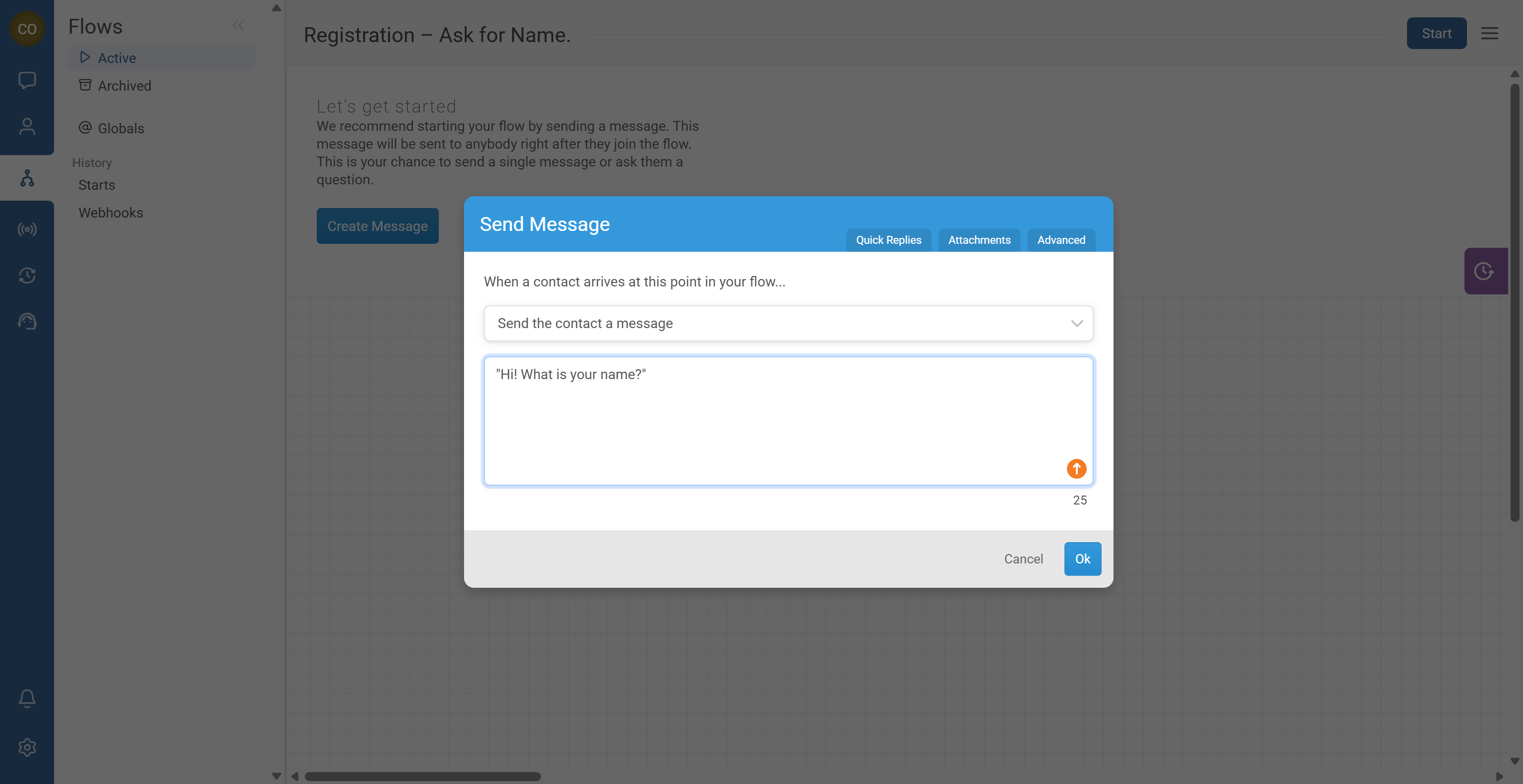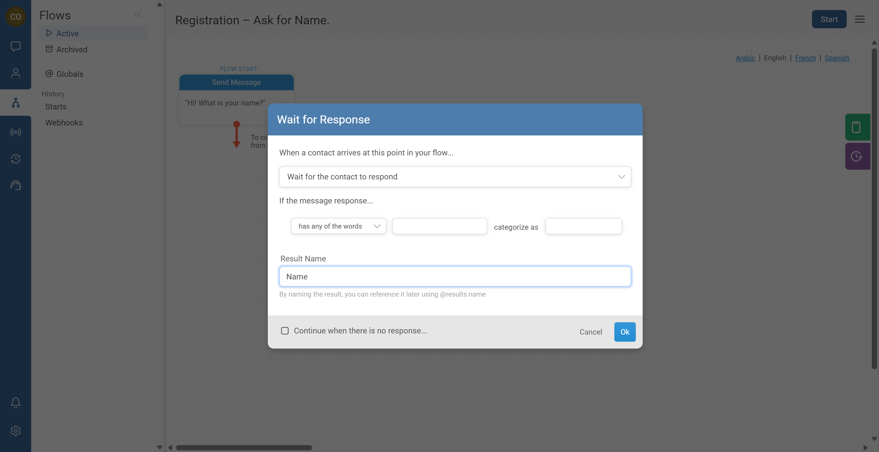 - Add a Send Message node that asks for the contact’s name