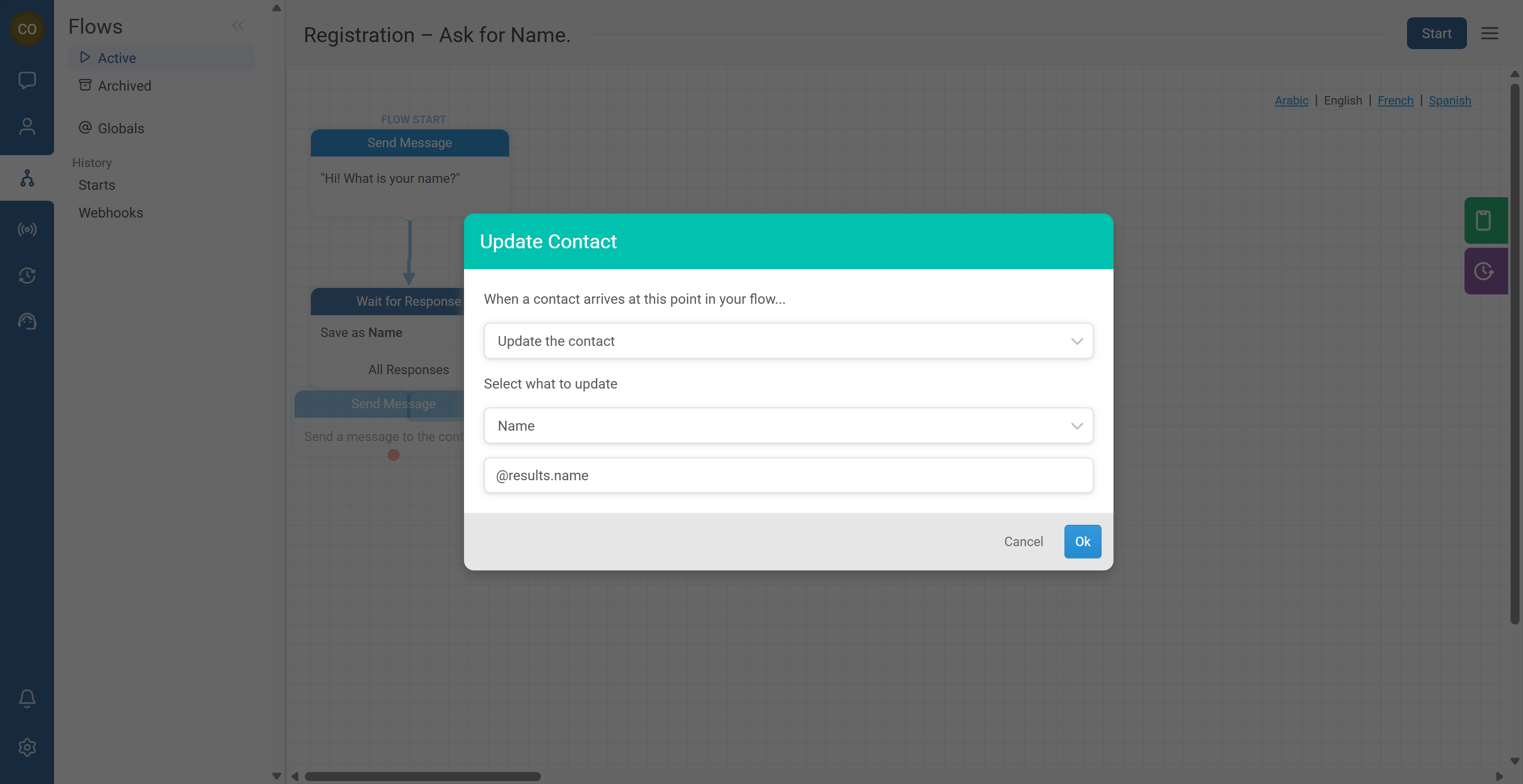 Fix: In Wait for Response, confirm the result name is set (e.g., “Name”). In Update the Contact, verify the field is correct and the value points to @results.name (matching your result key).