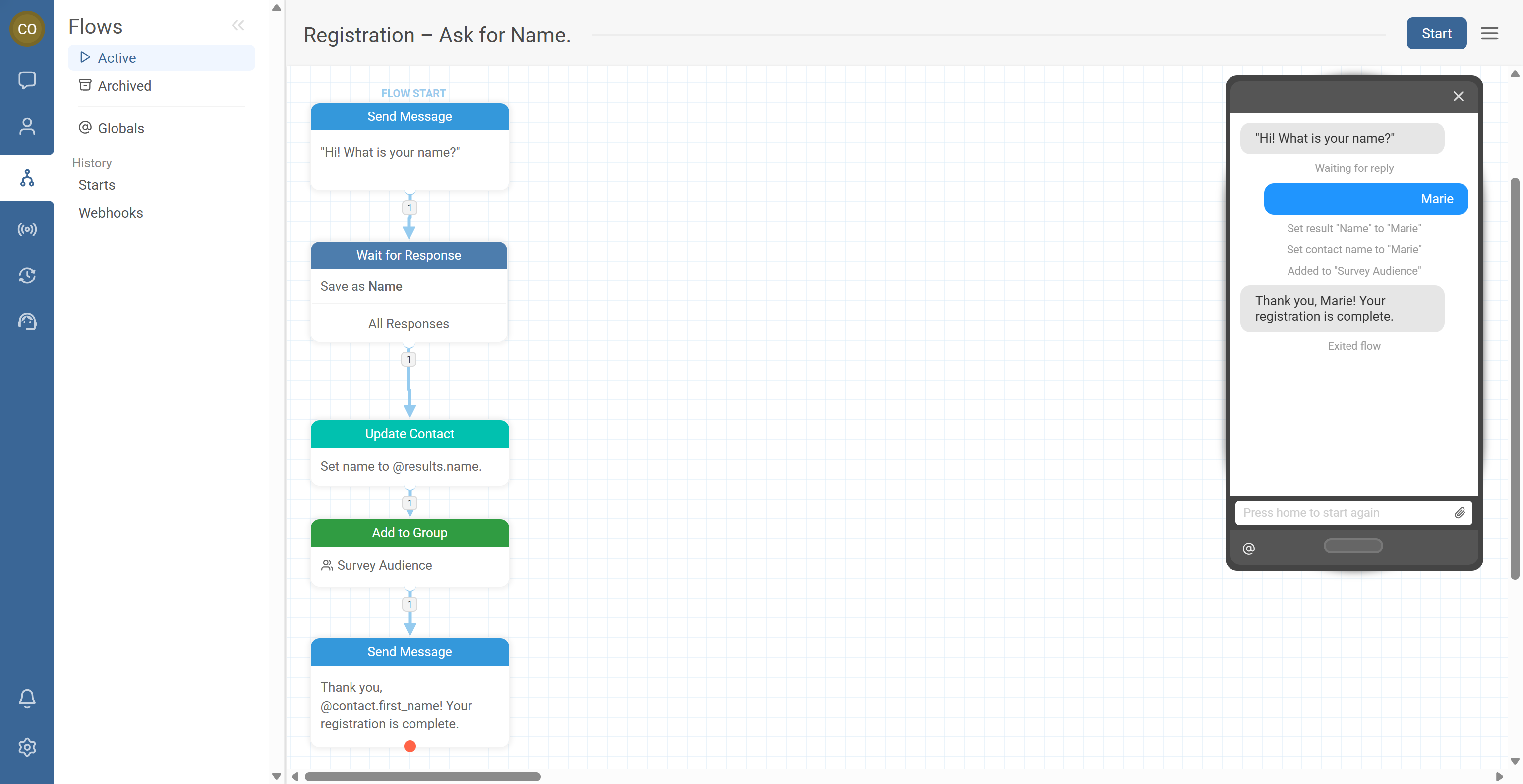 @contact.first_name keeps confirmation messages short and friendly.- In the flow editor, locate the simulator panel (on the right side).