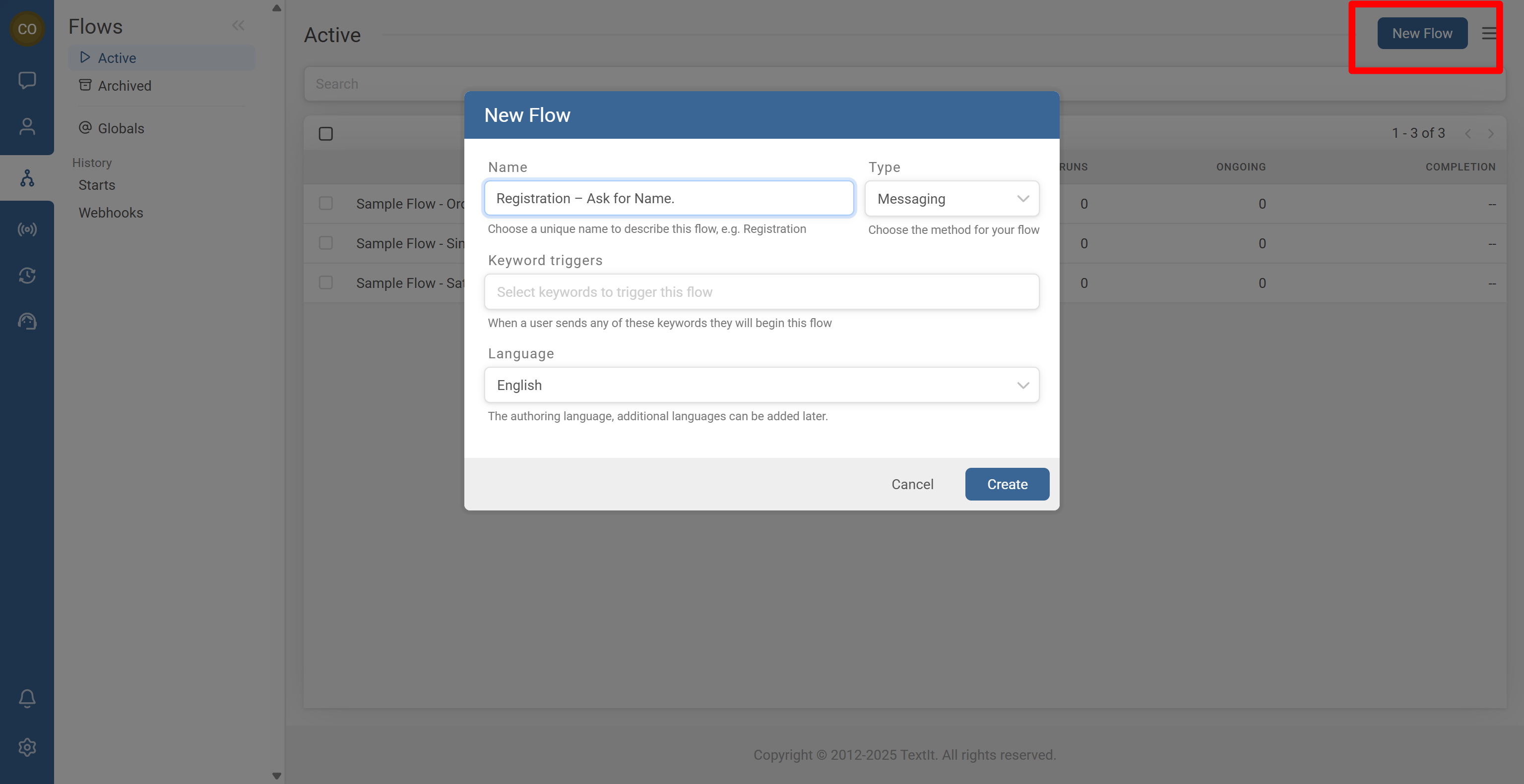- Create a new Messaging flow from the Flows tab