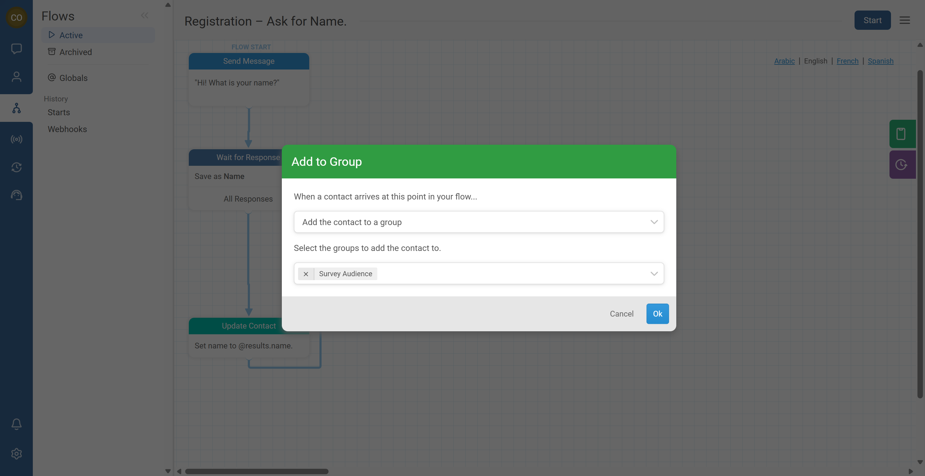 - Ask name → capture reply → save to contact → add to group → confirm